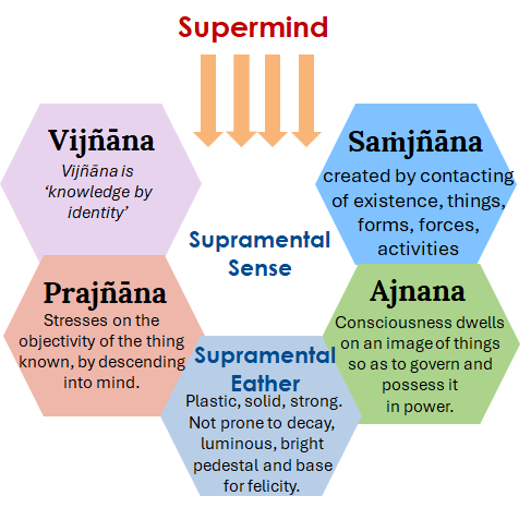 Supramental Sense action is a result of the extension and vibration of being and Consciousness in a Supra-ethereal Ether of light, Ether of power, Ether of bliss. The Supramental sense, is formed with infinite or universal substance and so it knows everything by the conscious being’s contact and substantial awareness of its own extended substance of self and everything in it -force, play and action,
