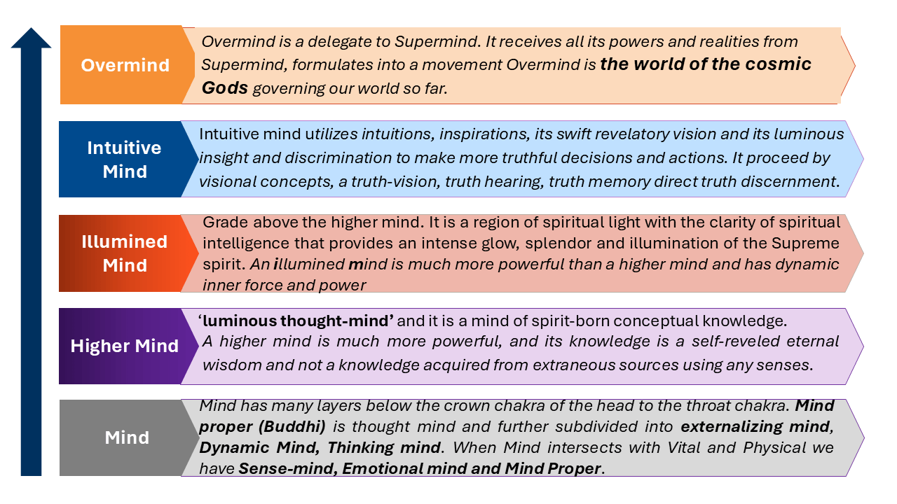 He further describes that Mind has to first evolve to Higher Mind, then to Illumined Mind, Intuitive Mind, Overmind, and then to Supermind which is the path for Evolution and then Transformation.